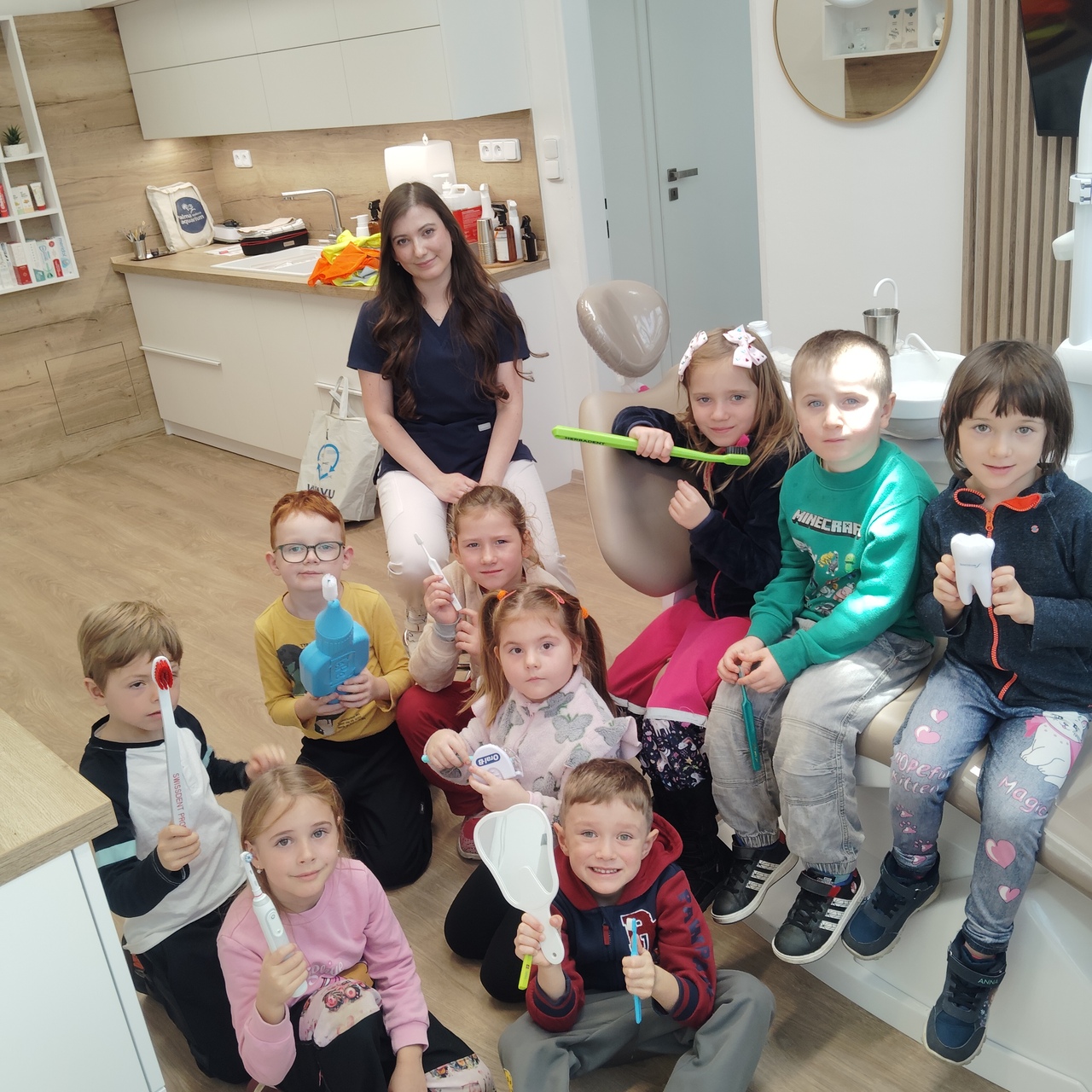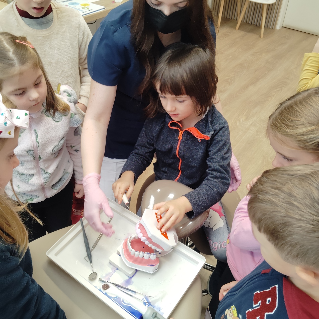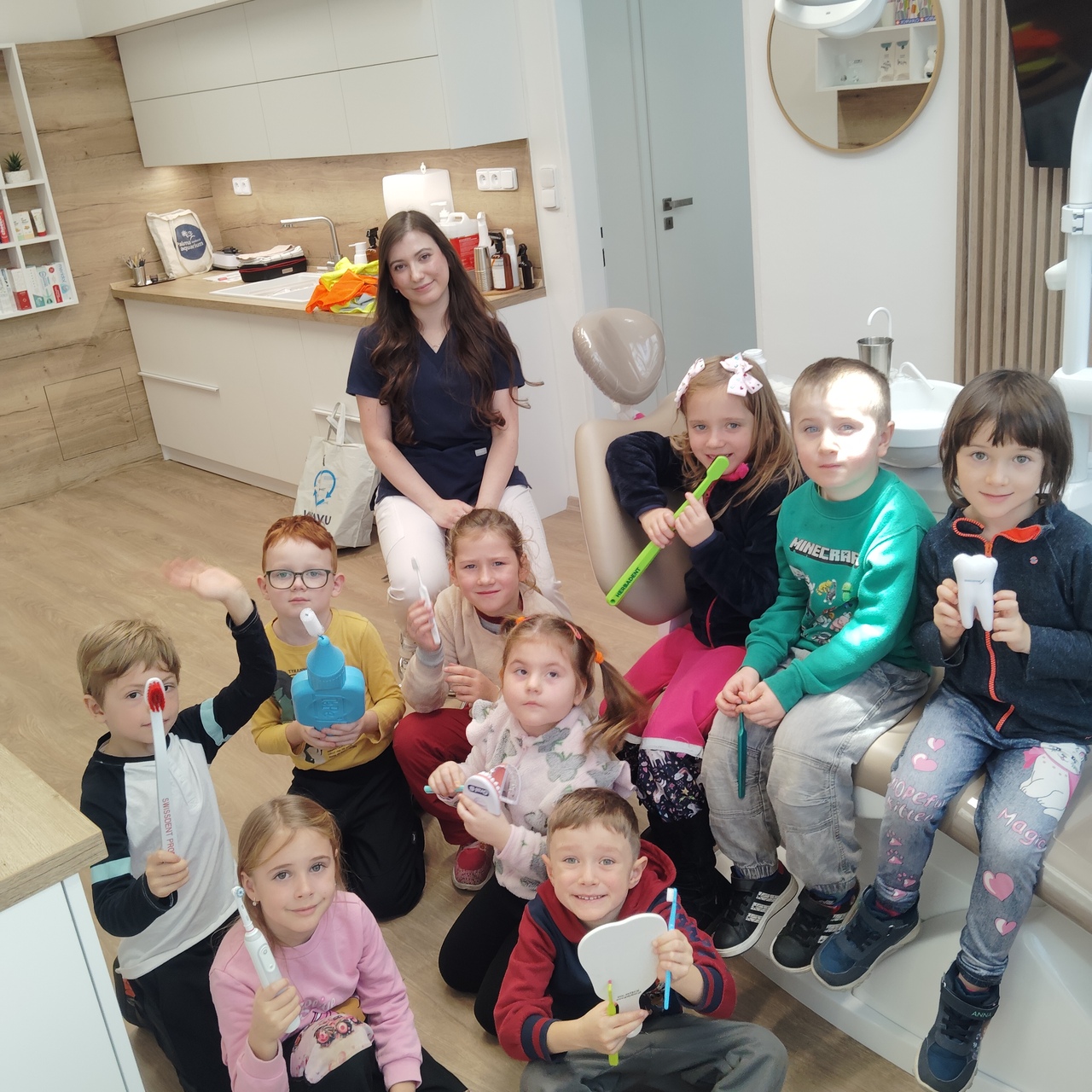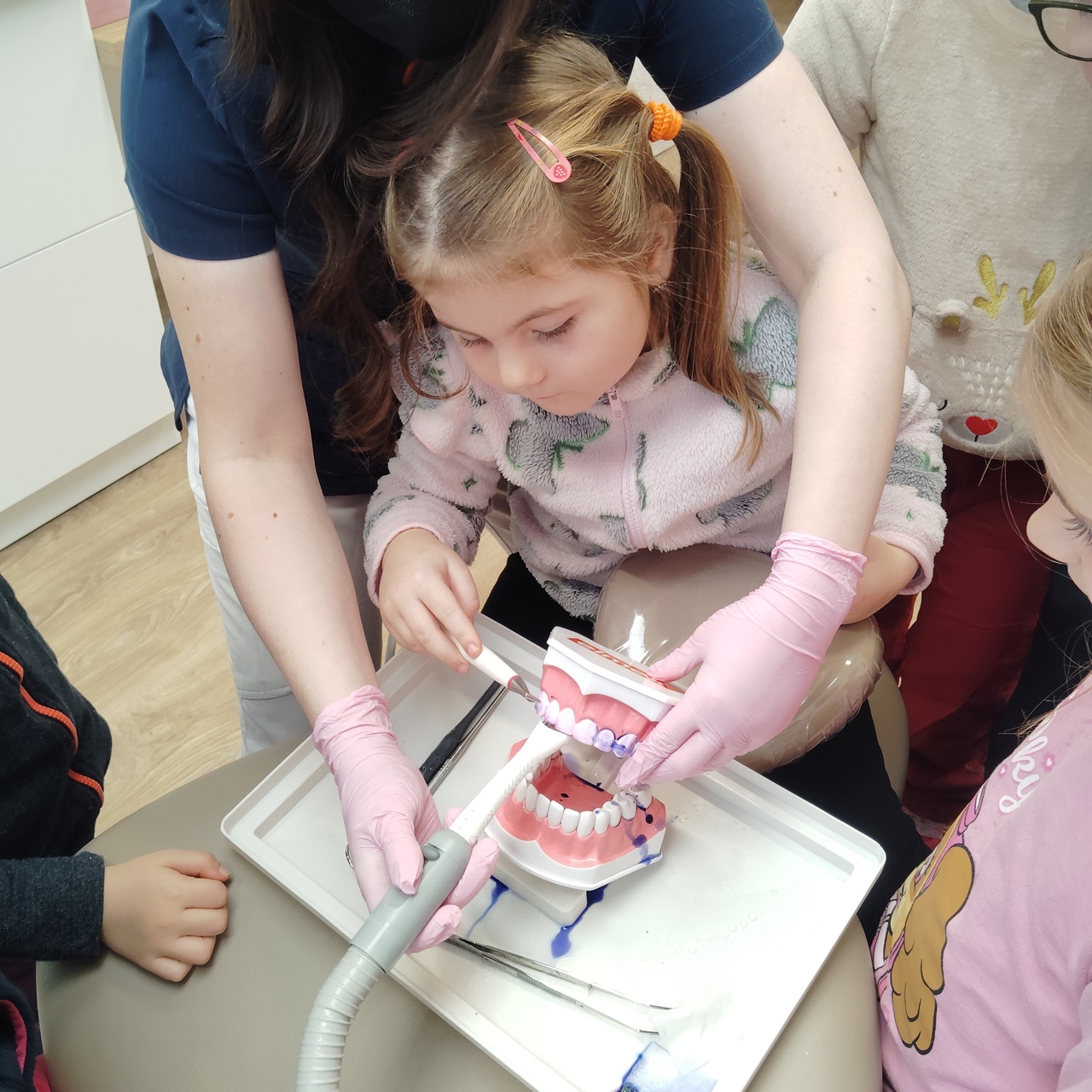 Návštěva v ordinaci dentální hygienistky byla pro děti velkým zážitkem, zábavnou formou se učily, jak správně čistit zuby a plnily i zábavné úkoly. Do školky se vrátily s malým dárkem a plny dojmů.