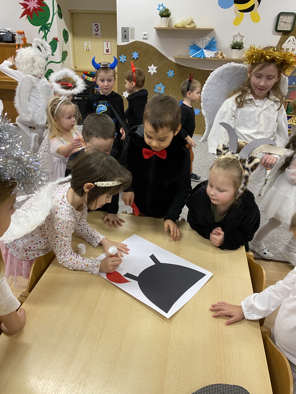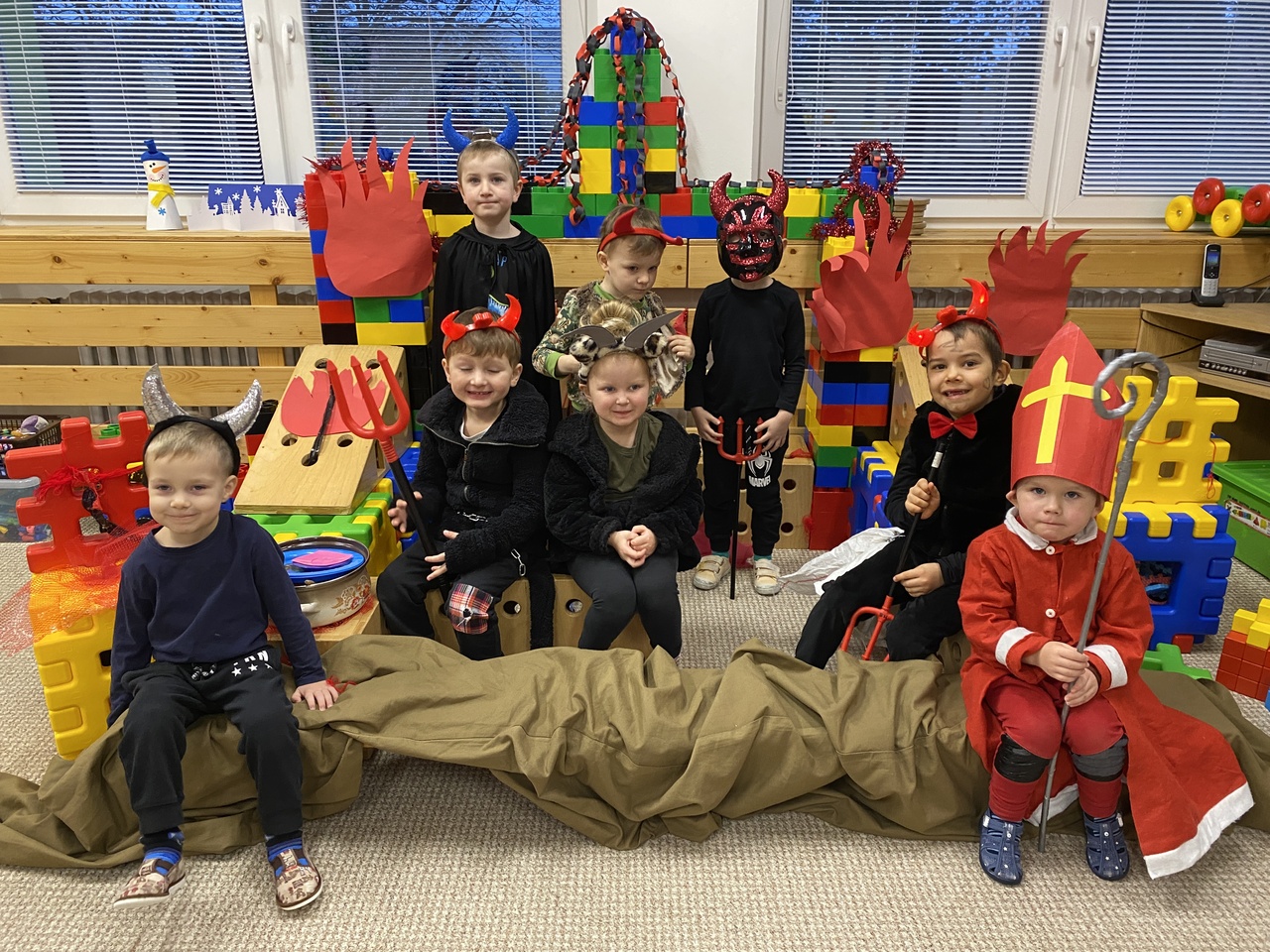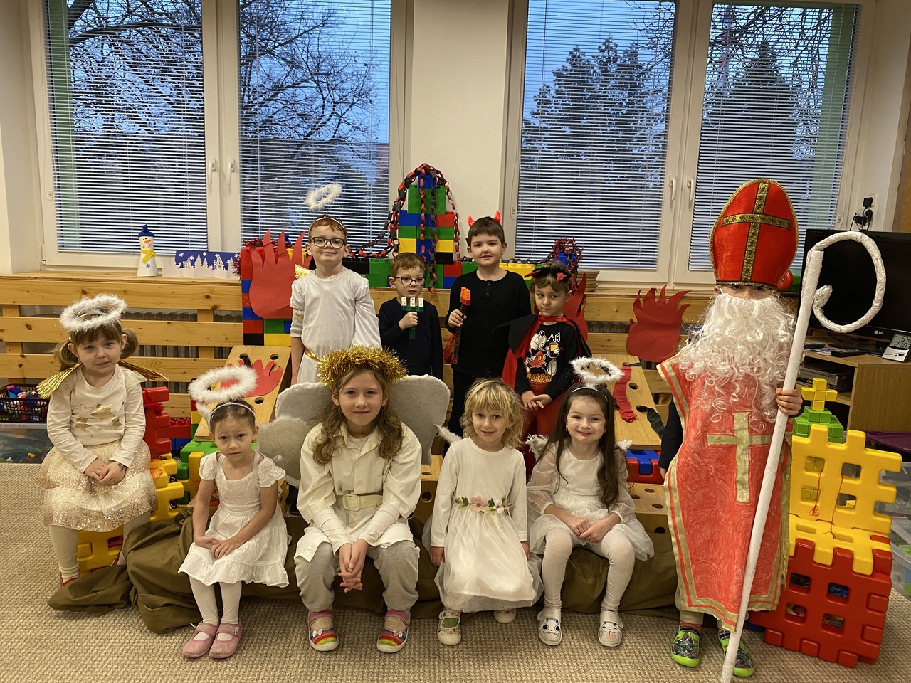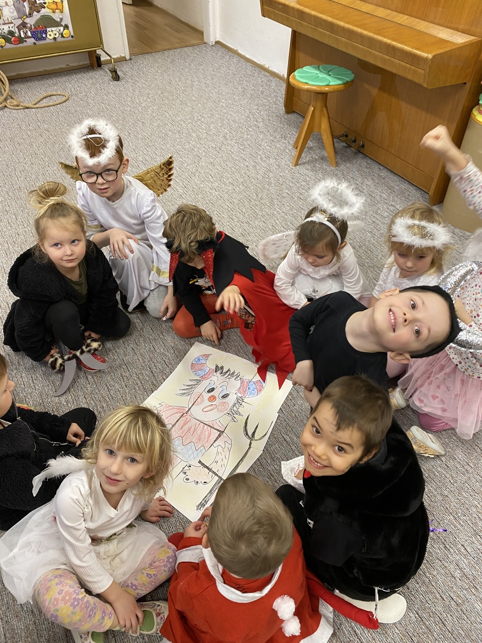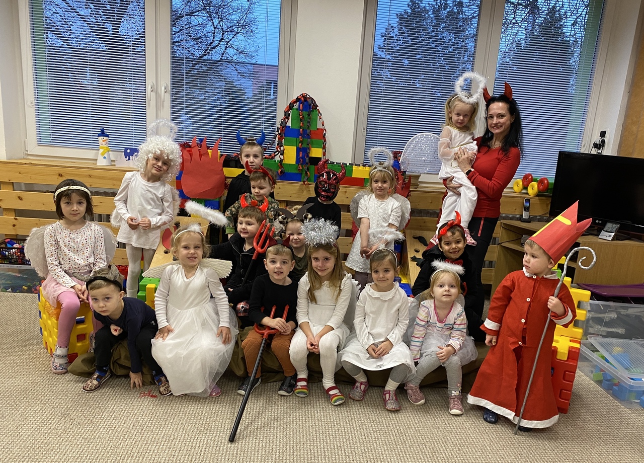 Od rána se ve školce scházeli nejen čertíci ale i andělé a dorazili i dva Mikuláši. Školka se proměnila v peklo a nebe, děti plnily různé úkoly a dokonce i svačinka byla čertovská. Nakonec přišel i Mikuláš se svým doprovodem a přinesl dětem nadílku.