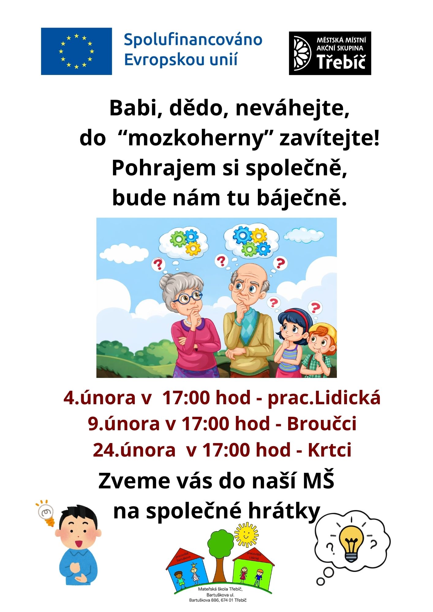 Srdečně zveme naše děti a jejich rodiče a prarodiče na odpoledne plné zajímavých aktivit i soutěží. Věříme, že se u nich pobavíte a zaujmou vás různé logické úkoly a hry, které pro vás budou připraveny.